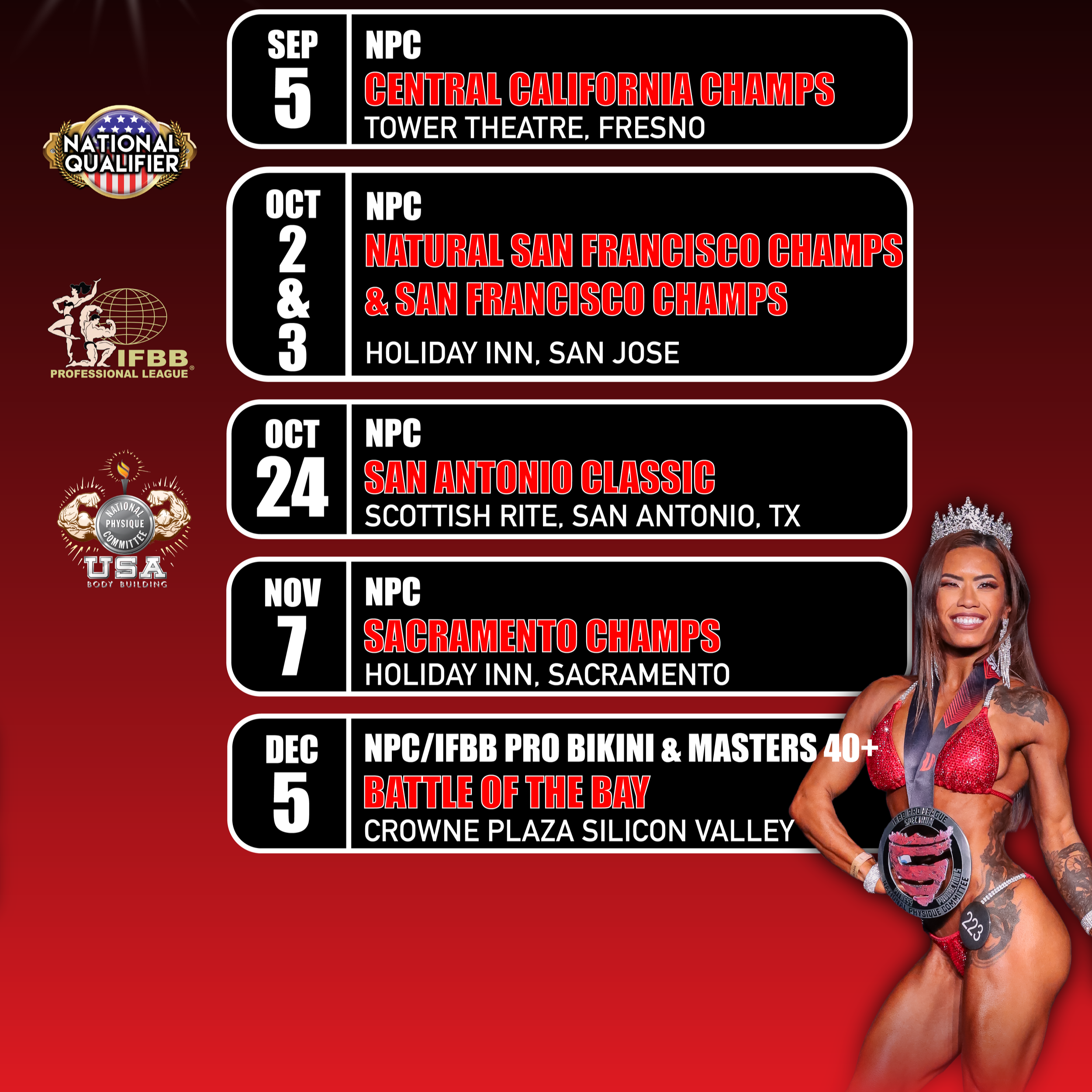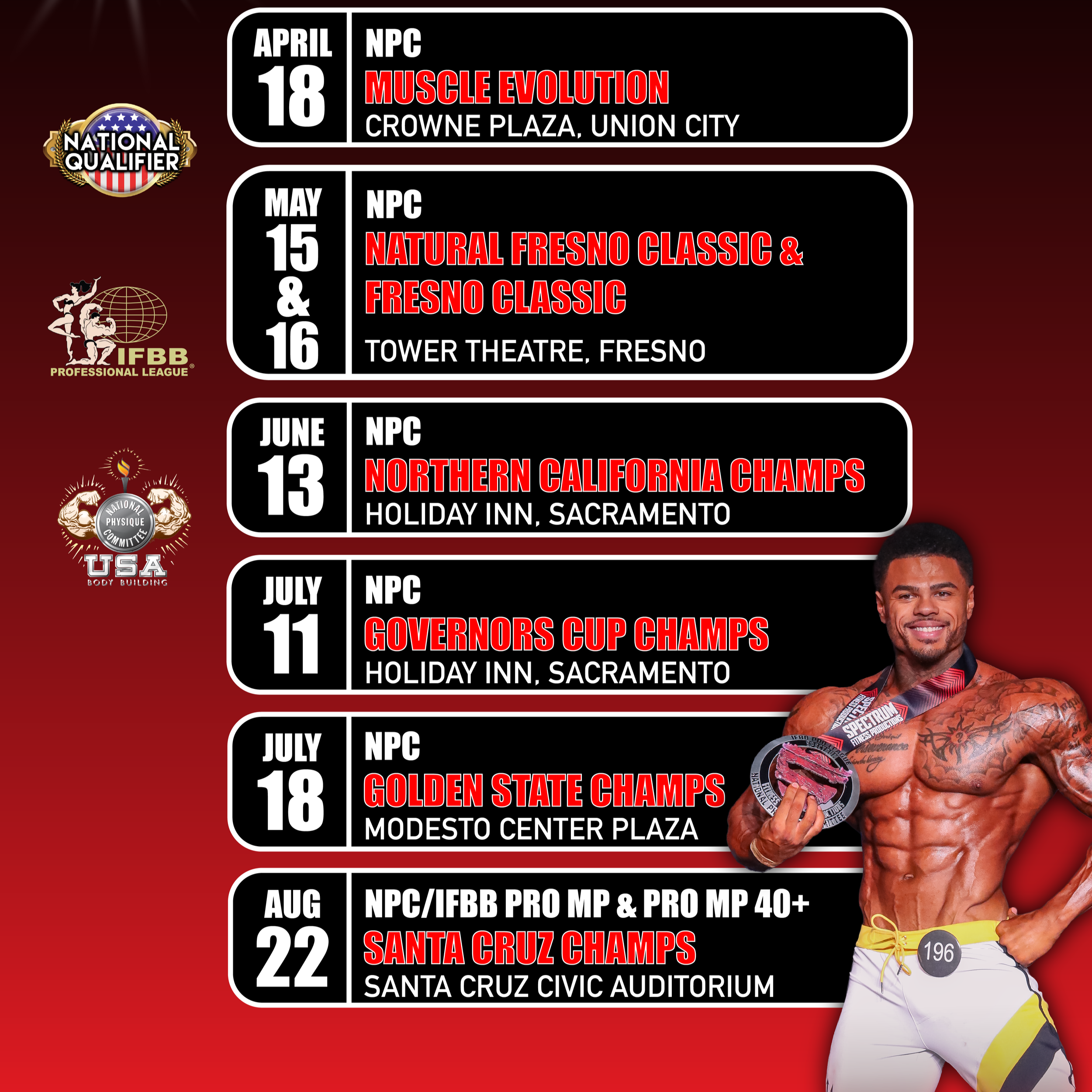 Since 1985, Spectrum Fitness Productions has energized the bodybuilding world with premier NPC and IFBB Pro League events across Northern California. We deliver a high-impact, athlete-focused stage where passion, performance, and community come together to create champions!